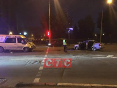 У пешеходного перехода лоб в лоб столкнулись легковушка и служебный микроавтобус. По словам свидетелей, автомобиль въехал в бус, когда тот стоял на светофоре.