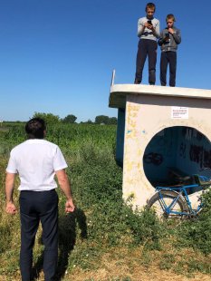 Та дорога дорогою, місцевий колорит і все таке, якби ж не диво дивне – посеред поля закинута зупинка громадського транспорту, під нею велосипед, а на ній – двоє хлопчаків. Стоять на даху і у небо дивляться. Мрійники-бешкетники малі, спадає перша думка. Хоча, чого посеред поля і чого на даху?