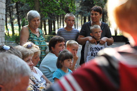 Нас поселили в лагере «Жемчужина Донетчины» в городе Святогорске, неподалеку от Славянска. Сейчас население Святогорска за счет беженцев из Донецка, Горловки, Славянска и др. только официально увеличилось вдвое. Так, в мирное время городское население составляло 4,8 тыс. человек, сейчас же официально их 8,1 тыс., а по неофициальным данным, с учетом незарегистрированных переселенцев, достигло 15 тыс. человек.Татьяна Божко, секретарь Святогорского горсовета: «Особенно помогают Запорожская и Сумская бласти. Спасибо им за картошку»