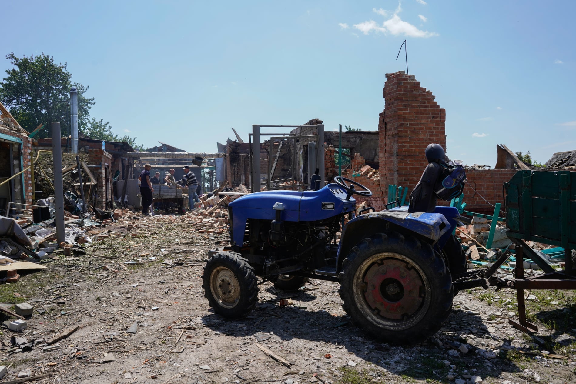Мешканці прибирають сміття з подвір'я будинку після атаки російського безпілотника минулого місяця в селі Великий Бобрик. Фото: Global Images Ukraine/Getty Images