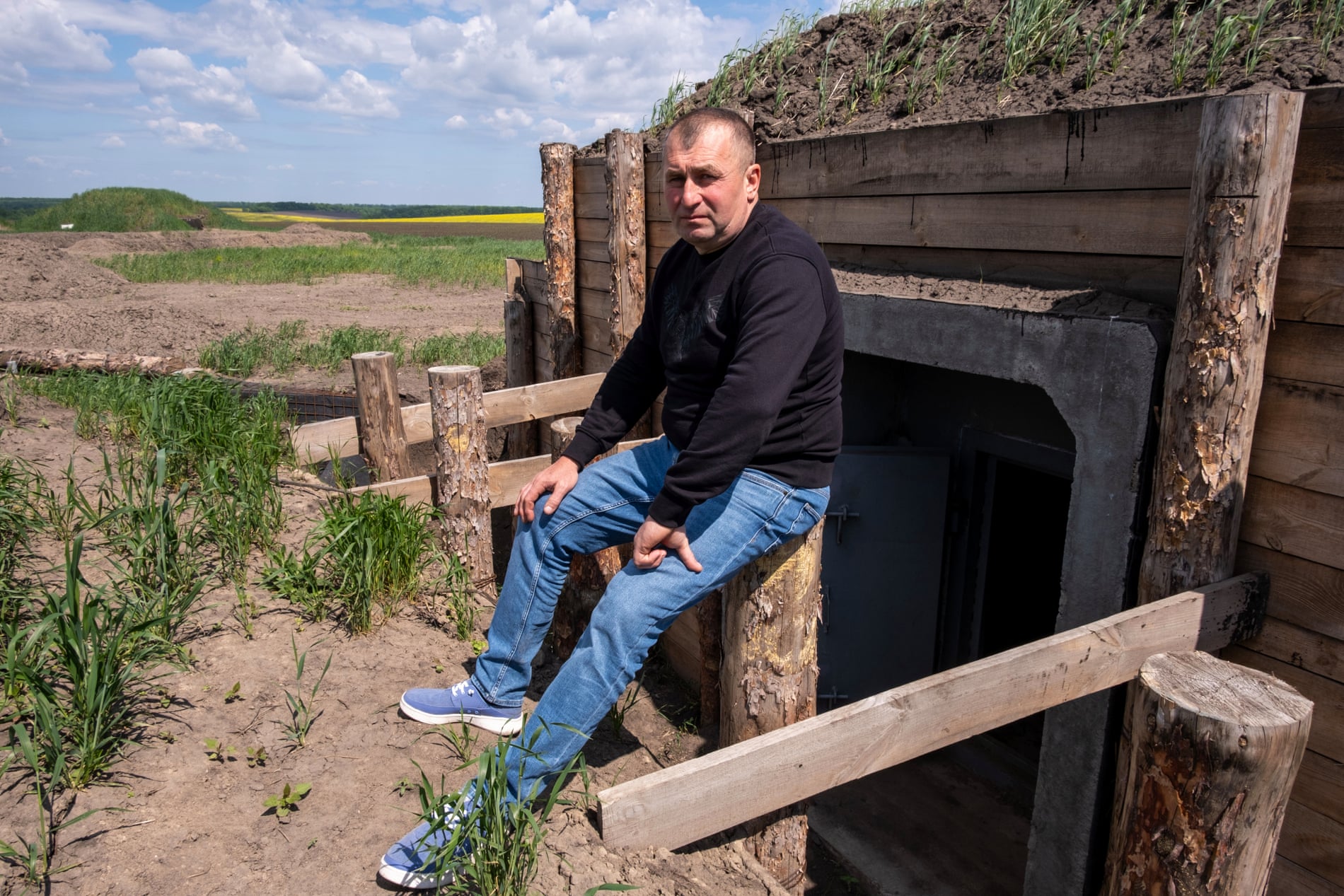 Андрій Сема сидить перед новозбудованим військовим блокпостом у системі окопів на своїй землі в Сумах. Фото: Пітер Бомонт/The Guardian