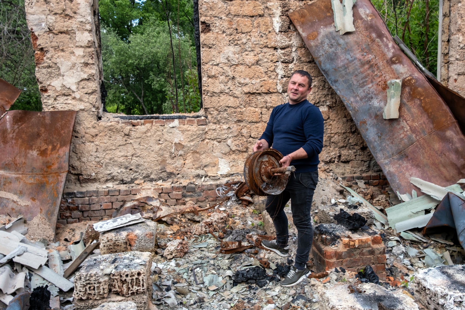 Микола Панасенко стоїть на руїнах свого фермерського офісу в Сумах. Фото: Пітер Бомонт/The Guardian