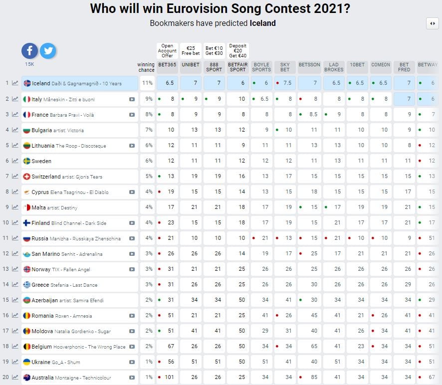 Первое место букмекеры отвели группе Daði Freyr из Исландии, хотя конкурсная песня будет представлена только 10 марта.