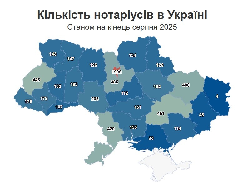 Найбільше нотаріусів зосереджено у Києві — 1 292, що становить майже чверть від загальної кількості. Також високі показники мають Дніпропетровська (451), Львівська (446) та Одеська (420) області. Натомість у прифронтових регіонах кількість нотаріусів різко скоротилася — у 20 разів на Луганщині, у 4 рази на Херсонщині та Донеччині, майже удвічі на Запоріжжі. Такі дані наводить Опендатабот.