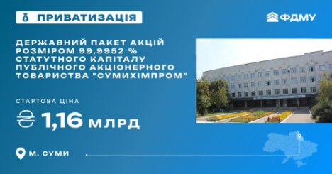 Фонд державного майна України оголосив онлайн-аукціон з великої приватизації державного пакета акцій розміром 99,9952 % статутного капіталу публічного акціонерного товариства "Сумихімпром” у м. Суми. Торги відбудуться у системі «Прозорро.Продажі» 11 червня, подання пропозицій для участі у торгах приймаються до 10 червня, 20:00.