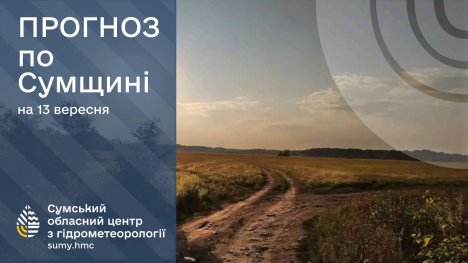 13 вересня: мінлива хмарність, без опадів. Вітер східний, 5-10 м/с. Температура повітря по області вночі +6°..+11°, вдень, +18°..+23°, по м.Суми вночі +7°..+9°, вдень, +20°..+22°.