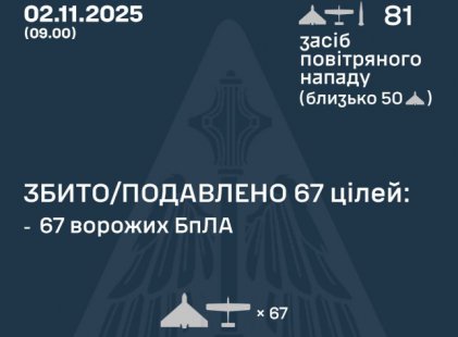 За попередніми даними, станом на 09:00, протиповітряною обороною збито/подавлено 67 ворожих БпЛА типу Shahed, Гербера і дронів інших типів на півночі, півдні та сході країни.