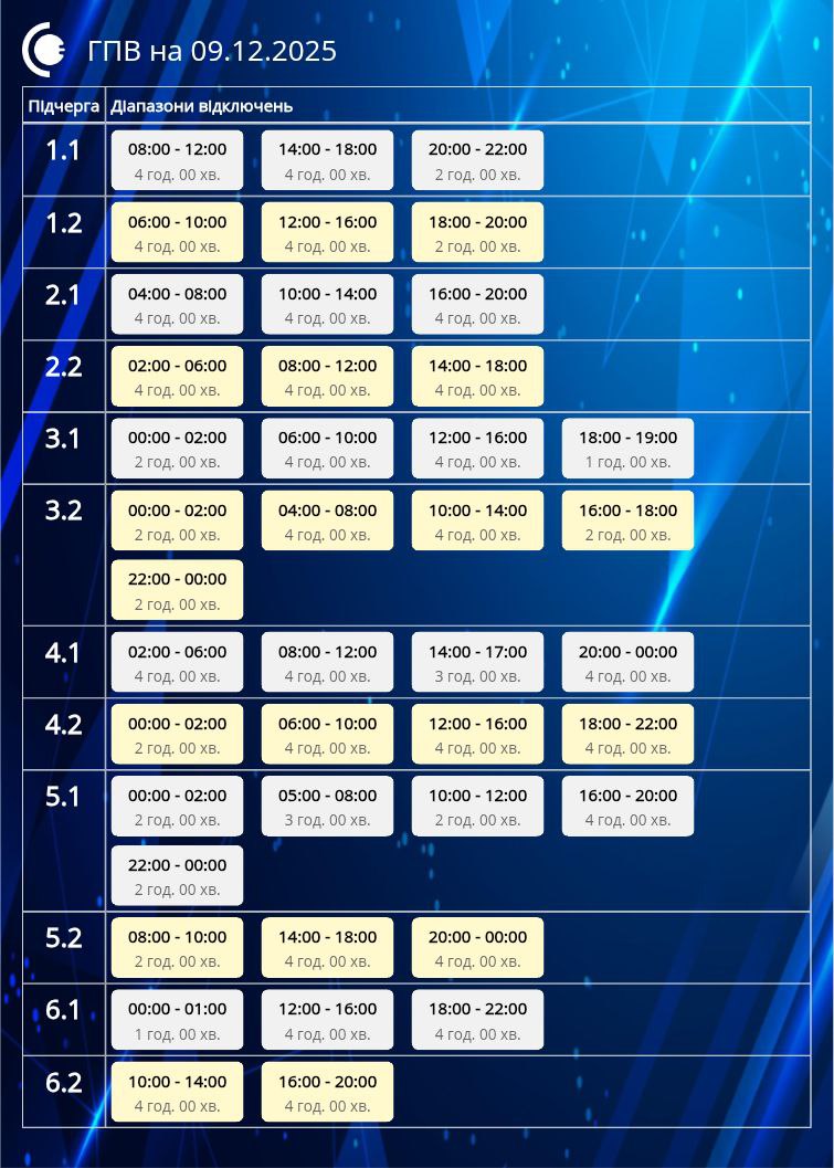 Завтра, 7 грудня, діятимуть жорсткі графіки погодинних відключень....