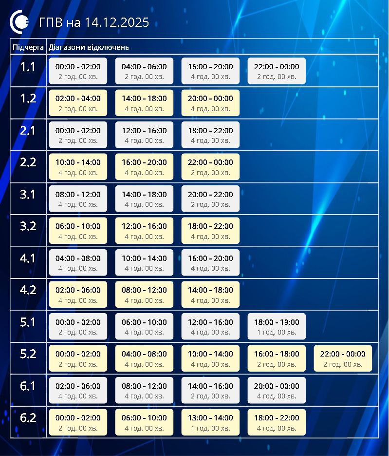 АТ «Сумиобленерго» оприлюднило графіки погодинних відключень на завтра, 14 грудня – за командою НЕК «Укренерго».