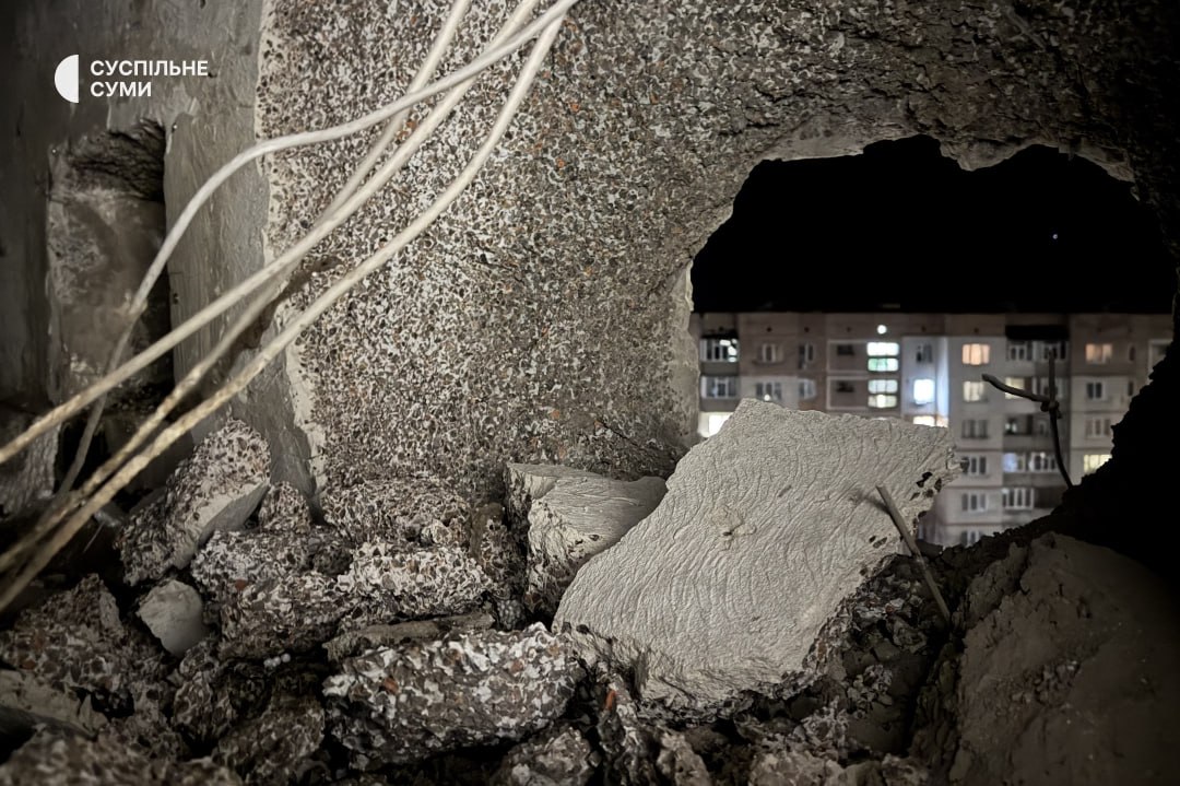Внаслідок влучання в Зарічному районі найбільших пошкоджень зазнали верхні поверхи багатоповерхового житлового будинку.