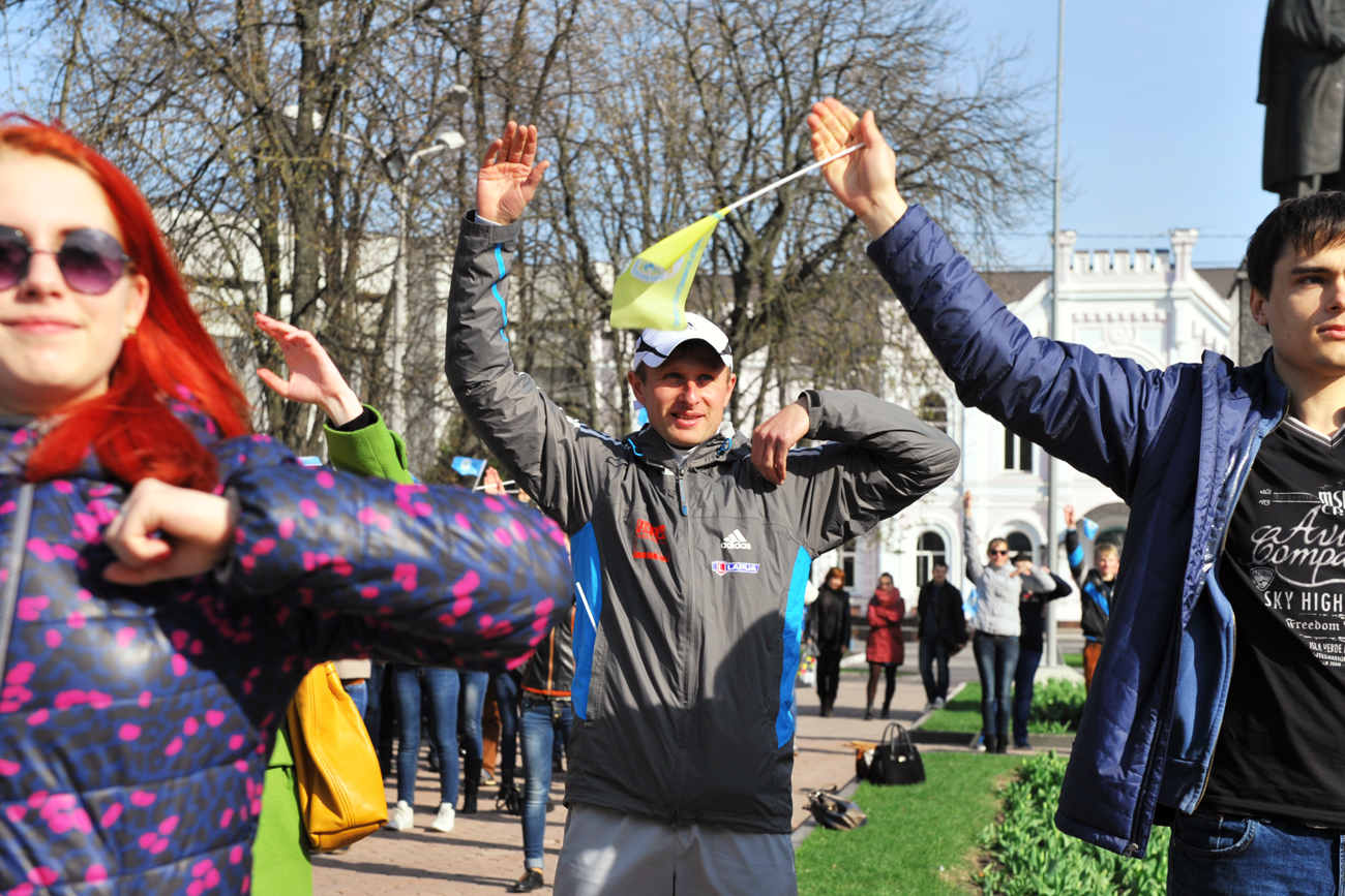 В спортивной акции приняло участие 250 сумчан. Они под фонограмму хита Гайтаны «Україно, будьмо!» в течение нескольких минут исполняли ритмичные движения. В руках танцующие держали небольшие желто-голубые флажки со слоганом акции «Відповідальність починається з мене».