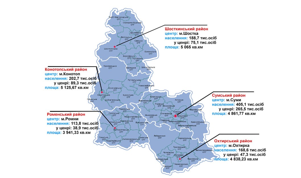 Это - Конотопский (с административным центром в городе Конотоп), Ахтырский (с административным центром в городе Ахтырка), Роменский (с административным центром в городе Ромны), Сумской (с административным центром в городе Сумы) и Шосткинский (с административным центром в городе Шостка). По плану реформы предполагается, что в ближайшее время Верховная Рада примет соответствующее постановление «Об образовании и ликвидации районов».