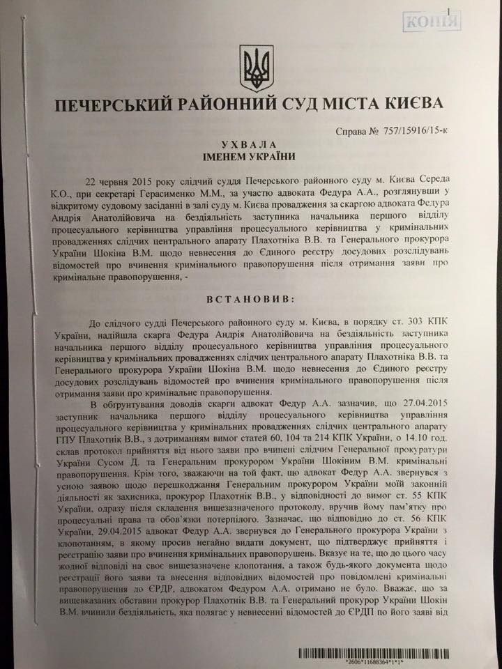 А хотите прикол? Против генпрокурора Украины Виктора Шокина таки возбудили уголовное дело. Печерский суд 22 июня удовлетворил заявление Андрея Федура (это адвокат Рината Кузьмина, кстати, в прошлом – адвокат Леси Гонгадзе) о возбуждении Генпрокуратурой Украины уголовного дела против своего начальника. Последний обвиняется во вмешательстве в деятельность защитника и нарочное неисполнение судебных решений. Причем первый раз Федур подавал 27 апреля, в саму ГПУ, ну а те, что характерно, отказались.