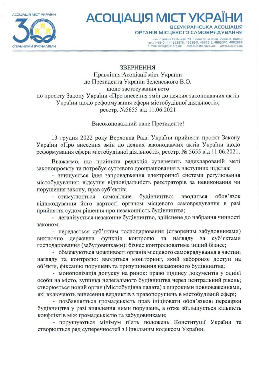 Серед численних зауважень та пропозицій Асоціація міст України зазначила, що законопроєкт №5655 в обов'язковому порядку необхідно доопрацювати задля: