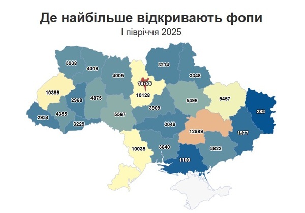 Лідером за кількістю нових ФОПів залишається Київ (18,8 тис.), за ним ідуть Дніпропетровська (13 тис.) та Львівська області (10,4 тис.). Столиця також очолює рейтинг за кількістю закритих підприємців — 20,6 тисяч, далі — Харківщина та Дніпропетровщина (по 13,6 тис.).