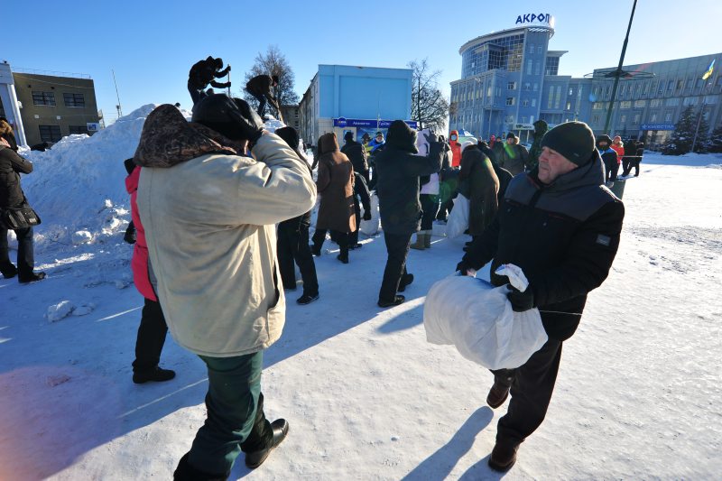 • Горожане быстро переносили мешки со снегом к облгосадминистрации.