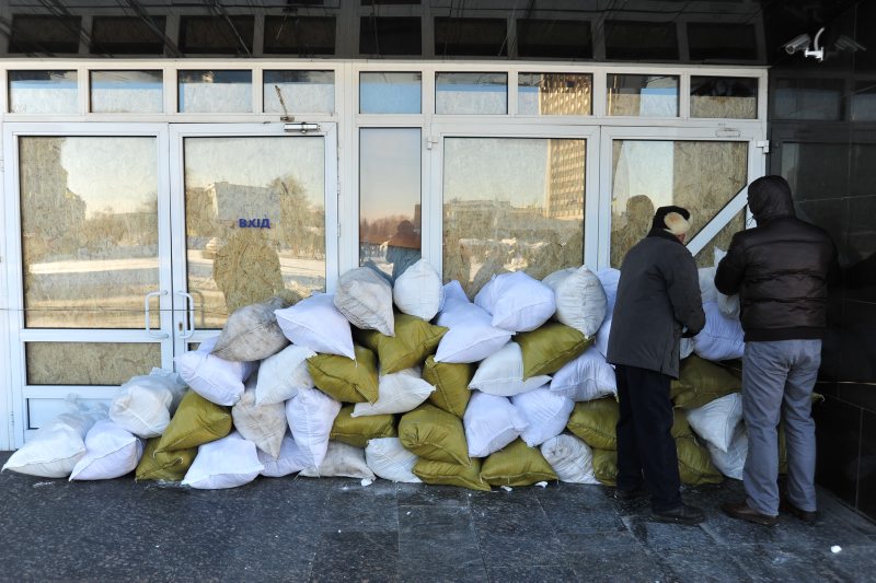 Оставшиеся на улице протестующие набирают снег в мешки для строительства баррикад, которые возводят перед входом в областную администрацию и мерию, чтобы завтра не допустить на работу чиновников.