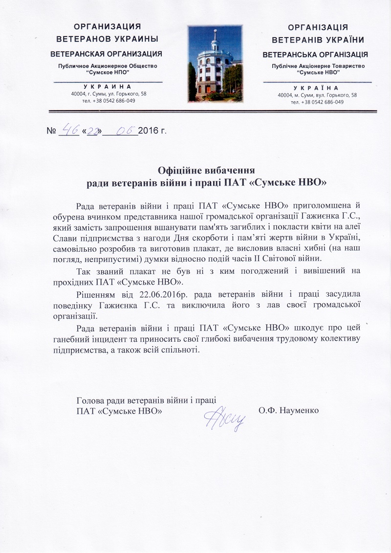 «Совет ветеранов войны и труда ПАО «Сумское НПО» потрясен и возмущен поступком представителя нашей общественной организации Гажиенко Г.С., который вместо приглашения почтить память погибших и возложить цветы на аллее славы предприятия по случаю Дня скорби и памяти жертв войны в Украине, самовольно разработал и изготовил плакат, где выразил собственные ложные (на наш взгляд, недопустимые) мысли относительно событий времен II Мировой войны.