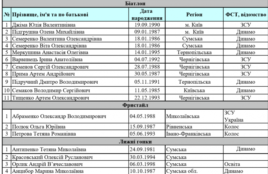 Все четверо украинских лыжников, получивших лицензии на Олимпийские игры, представляют Сумскую область: Андрей Орлик, Алексей Красовский, Татьяна Антипенко и Марина Анцыбор. Также от сумской регион делегировал двух биатлонисток Виту и Валентину Семеренко.