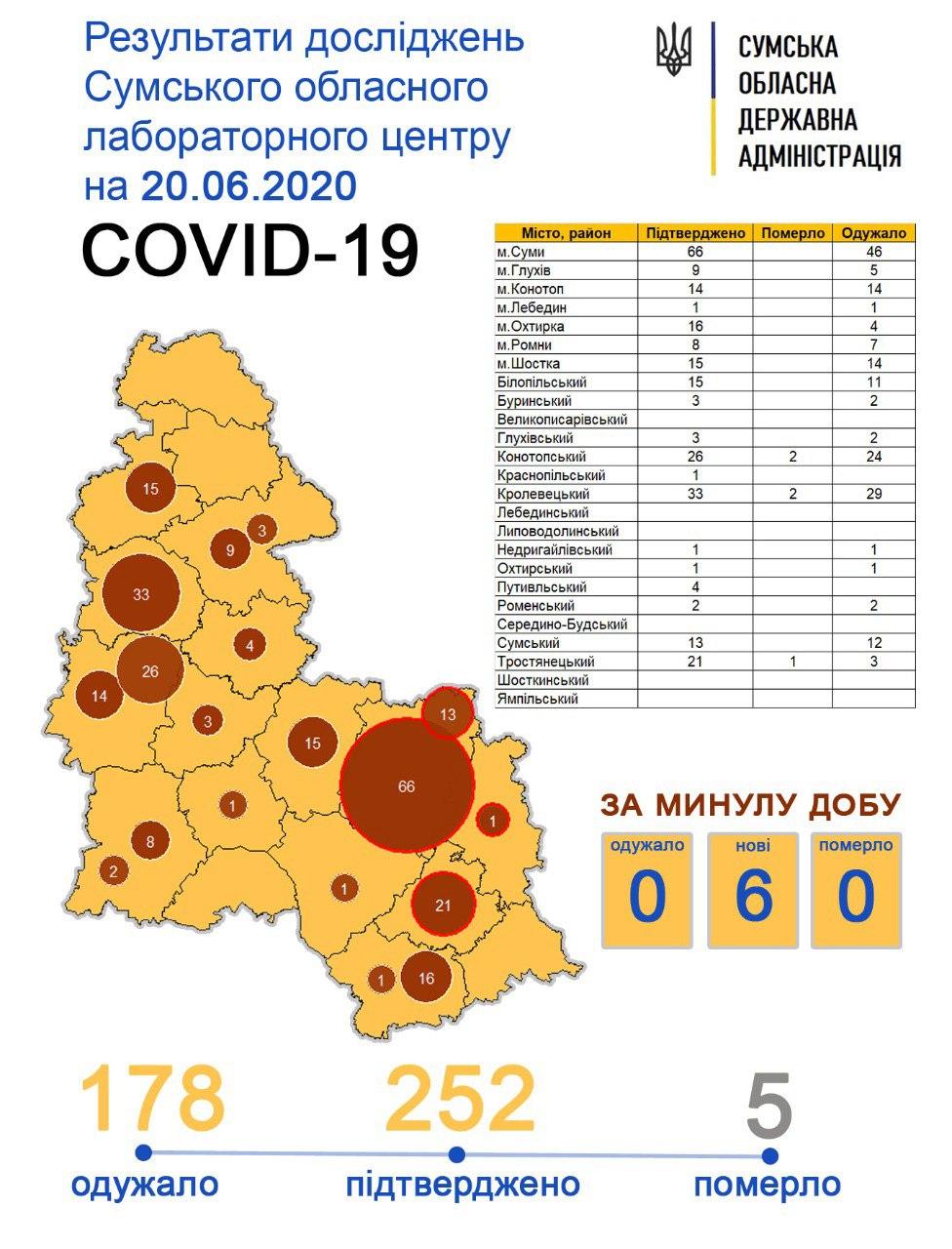 По информации Сумского областного лабораторного центра МЗ Украины, за все время пандемии коронавируса в Украине в г. Сумы было зафиксировано 66 случаев заболевания (46 вылечилось), в Сумском районе - 13 (12), г. Ахтырка – 16 (4), г. Конотоп - 14 (14), Конотопский район - 26 (24 вылечилось, 2 умерло), Кролевецкий район – 33 (29 вылечилось, 2 умерло), г. Шостка - 15 (14), Тростянецкий район – 19 (3 вылечилось, 1 умер), Роменский район – 2 (2), Недригайловский район – 1 (1), г. Ромны – 8 (7), Глуховский район – 3 (2), г. Глухов – 9 (5), Бурынский район – 3 (2), Ахтырский район – 1 (1), г. Лебедин – 1 (1), Белопольский район – 14 (11), Путивльский район – 4 (0 ), Краснопольский район – 1 (0 ).