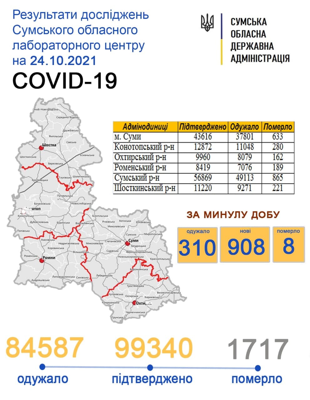 По состоянию на 24 октября за все время пандемии на Сумщине было зафиксировано 99 340 случаев заболевания коронавирусной инфекцией. Из них 1717 летальных случаев, за прошедшие сутки - 8 (Сумской р-н - 6, Шосткинский р-н - 2).