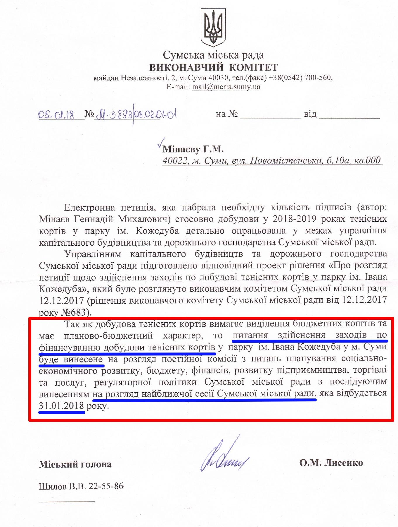 В ней говорилось, что после решение исполкома управление капитального строительства подготовило предложения планово-бюджетной комиссии, после чего его рассмотрят на «ближайшей» сессии 31 января 2018 года.