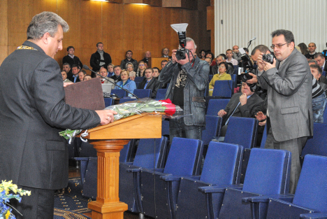 13/19 С цветами и колларом Мэр Сум Геннадий Минаев с букетом от горизбиркома Олег Демьяненко